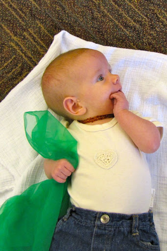 Catherine enjoyed the scarf before it was time for her to conk out at music class last week: